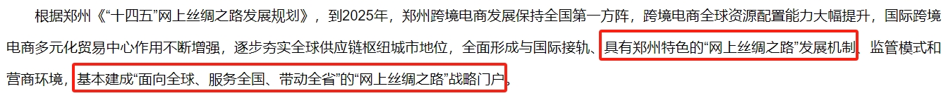 郑州《“十四五”网上丝绸之路发展规划》指出,到2025年,全面形成与国际接轨、具有郑州特色的“网上丝绸之路”发展机制、监管模式和营商环境,基本建成“面向全球、服务全国、带动全省”的“网上丝绸之路”战略门户。