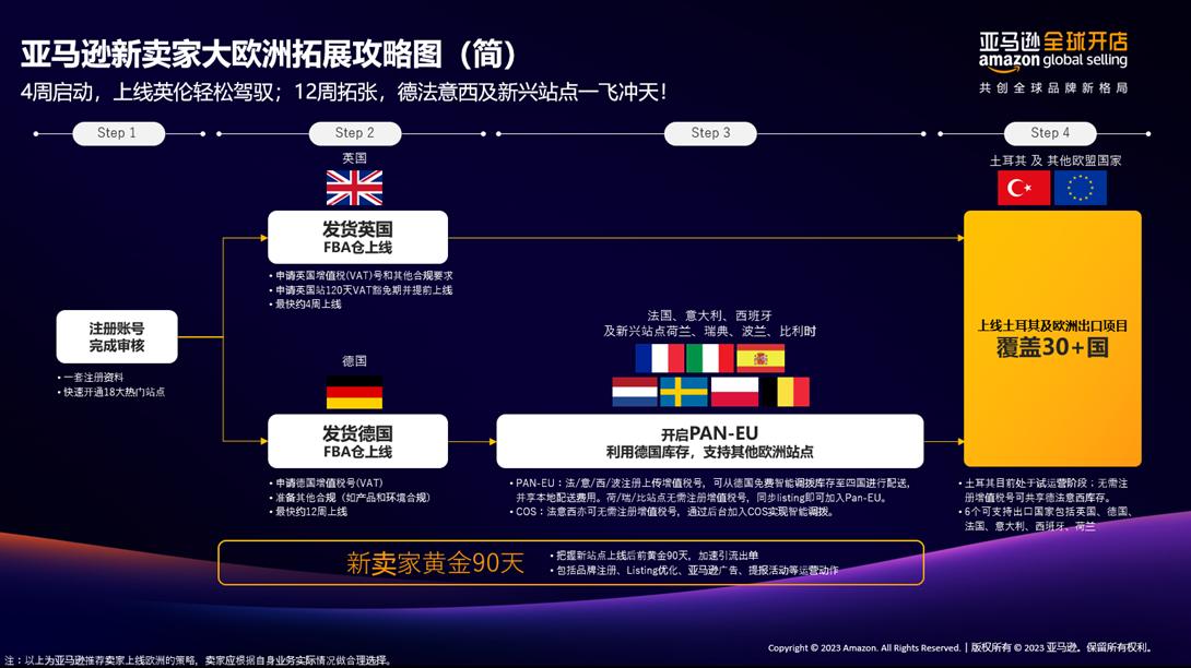 在具体的运营和新站点开拓上,卖家们只需四步,就能快速4周完成起步,最快12周就能在德法意西及新兴站点“一飞冲天”: