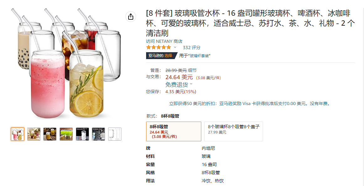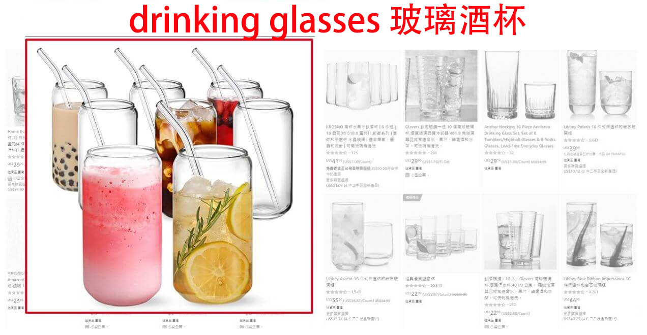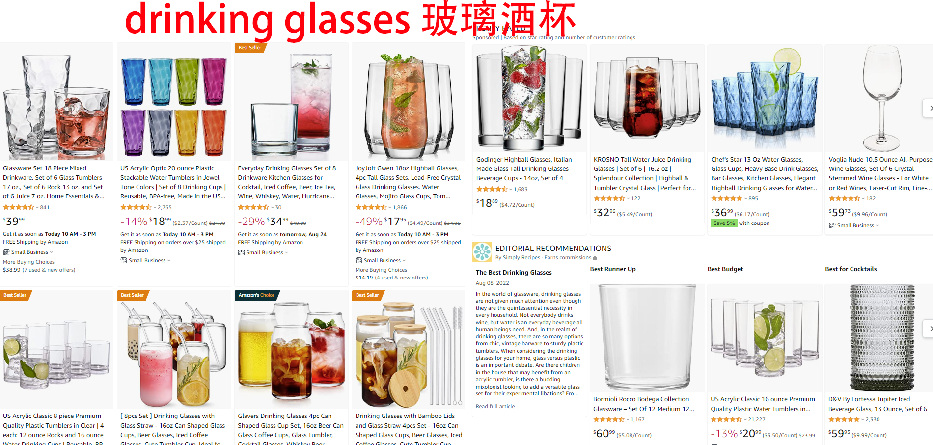 以「 drinking glasses」做关键字搜索, 在亚马逊上的搜索结果上大致看起来都没什么不同