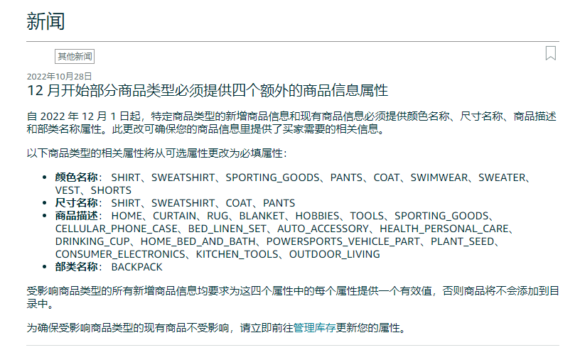 亚马逊在公告表示,这些产品类型的属性将从可选填更改必填。
