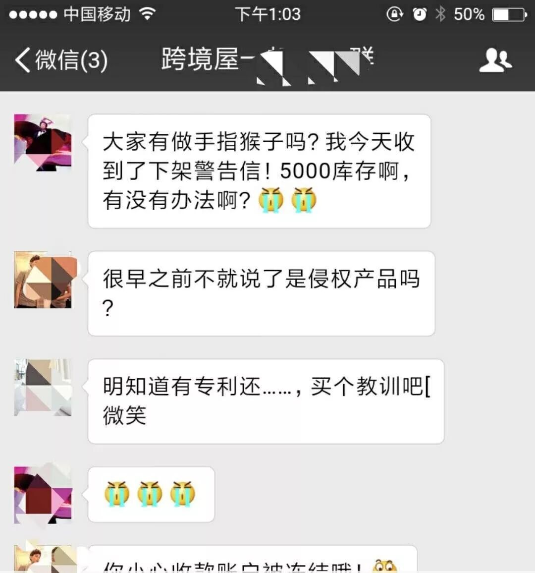我们收到了卖家的求助,说今天收到了下架的警告信,全因是手指猴惹的祸,该卖家还有5000的库存。