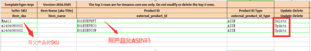 6、父产品删除库存管理显示404如何操作 打开下载好的产品所在类目对应的模板,复制子商品的SKU、ASIN粘贴在模板SKU、Product ID列,并且手动填写Product ID Type为“ASIN”。而“Update Delete”这一栏内填写“Delete”