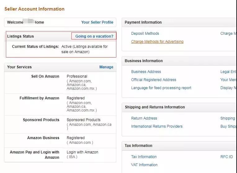 亚马逊后台设置有假期模式的设置,即“Going on a vacation”。假期模式下,FBA listing的销售不受影响。FBM的自发货将不再展示。
