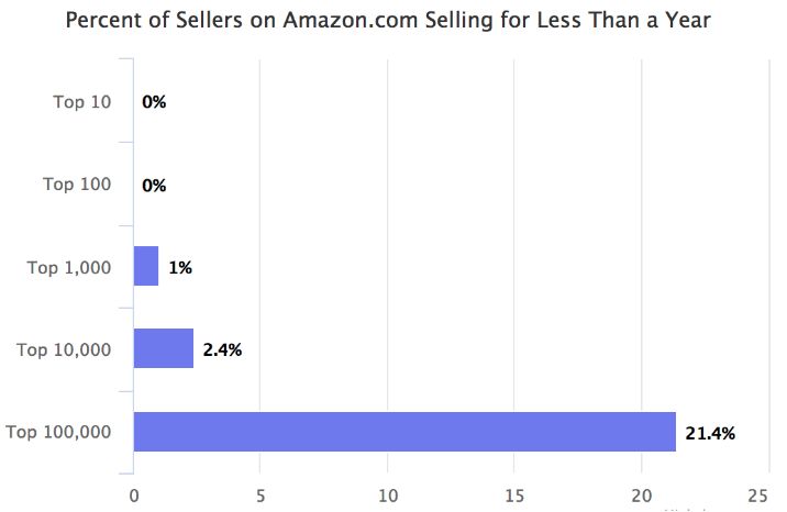 在2017年12个月里,亚马逊排名前10,000名卖家中,新卖家的占比仅为2.4%。以下是部分数据的显示: