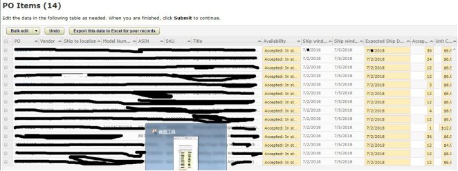 5.这里是所有订单的 ASIN,这里你可以选择确认接受数据,需要手动填写,以及拒绝等。在这里你可以导出所有的订单数据,用Excel 表打开,方便确认订单,也可以方便仓库分拣货物,做记录等(点击 Export this data to excel for your records)。
