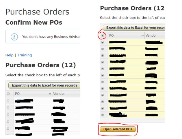 4.这里是所有的订单信息,点击复选框,选择全部,再点击 Open selected POs,
