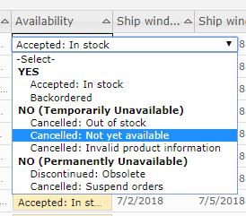 6.在这里填写状态,接受就是 In stock 咯,软拒绝就是 Out of stock 咯,硬拒绝就是 Obsolete。 接受的话就不多说,确认一下数量就ok;拒绝的话分两种,软拒绝次数超过5 次会扣款, 硬拒绝是不会扣款,但是下次就不会来订单了,怎么选择,自己斟酌。