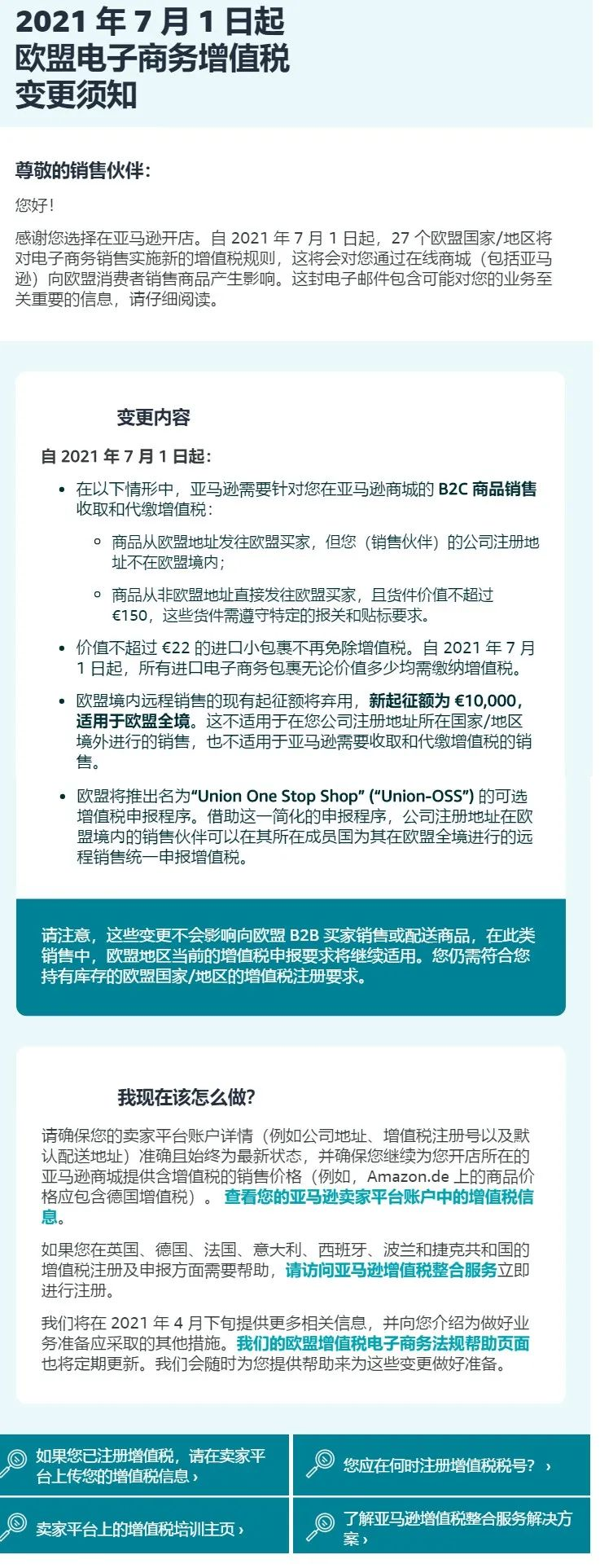 邮件(如下图)显示,自2021年7月1日起,亚马逊将对27个欧盟国家/地区的电子商务销售实施新的增值税规则,这会对卖家通过亚马逊等在线商城向欧盟消费者销售商品产生影响。