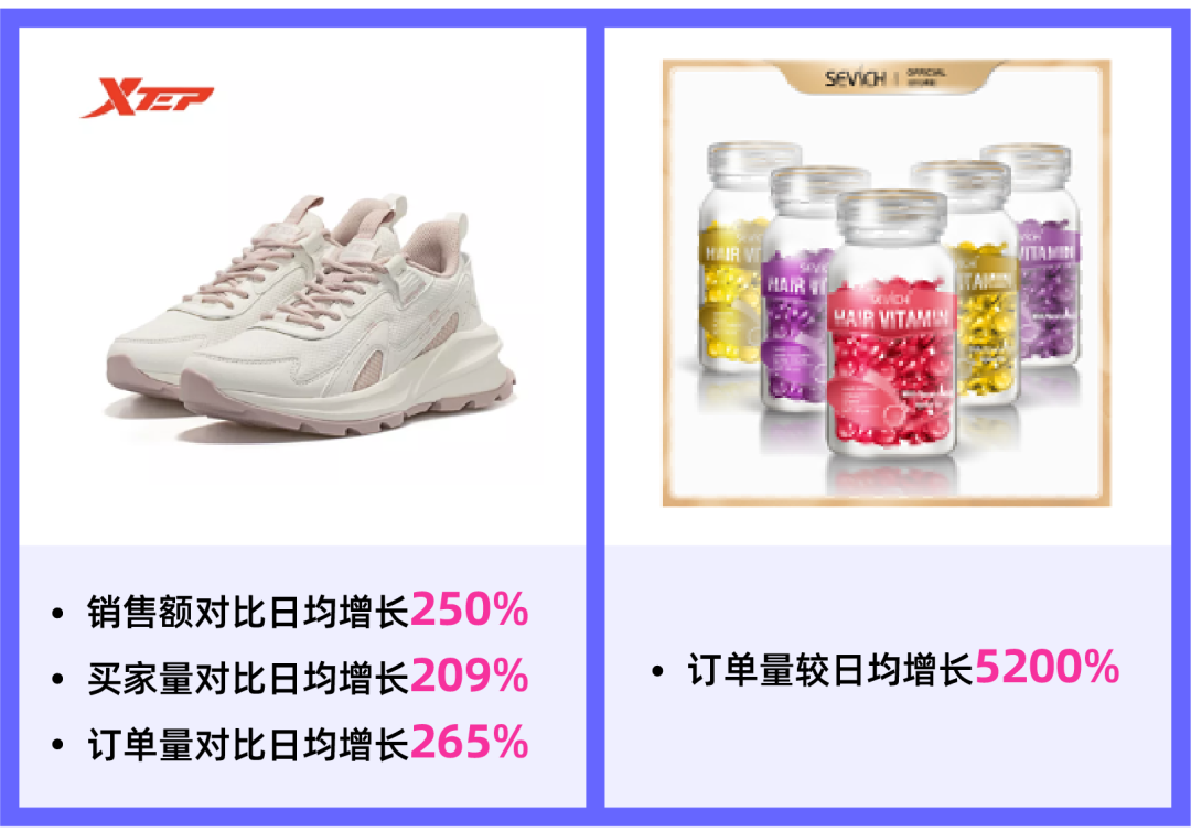 运动鞋品牌XTEP Official Store X特步和保健品品牌SEVICH两个商家通过平台推广及闪购活动进行爆品引流、吸粉和获得好评。单品订单量在今年12.12对比11.11均翻倍增长。