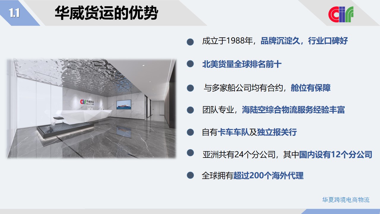 集团公司成立于1988年,品牌沉淀久,行业口碑好。北美货量全球排名前十,与多家船东均有合约,舱位有保障。海陆空综合物流服务经验丰富。自有独立报关行,亚洲共有24个分公司,其中国内设有12个分公司,全球拥有超过200个海外代理。