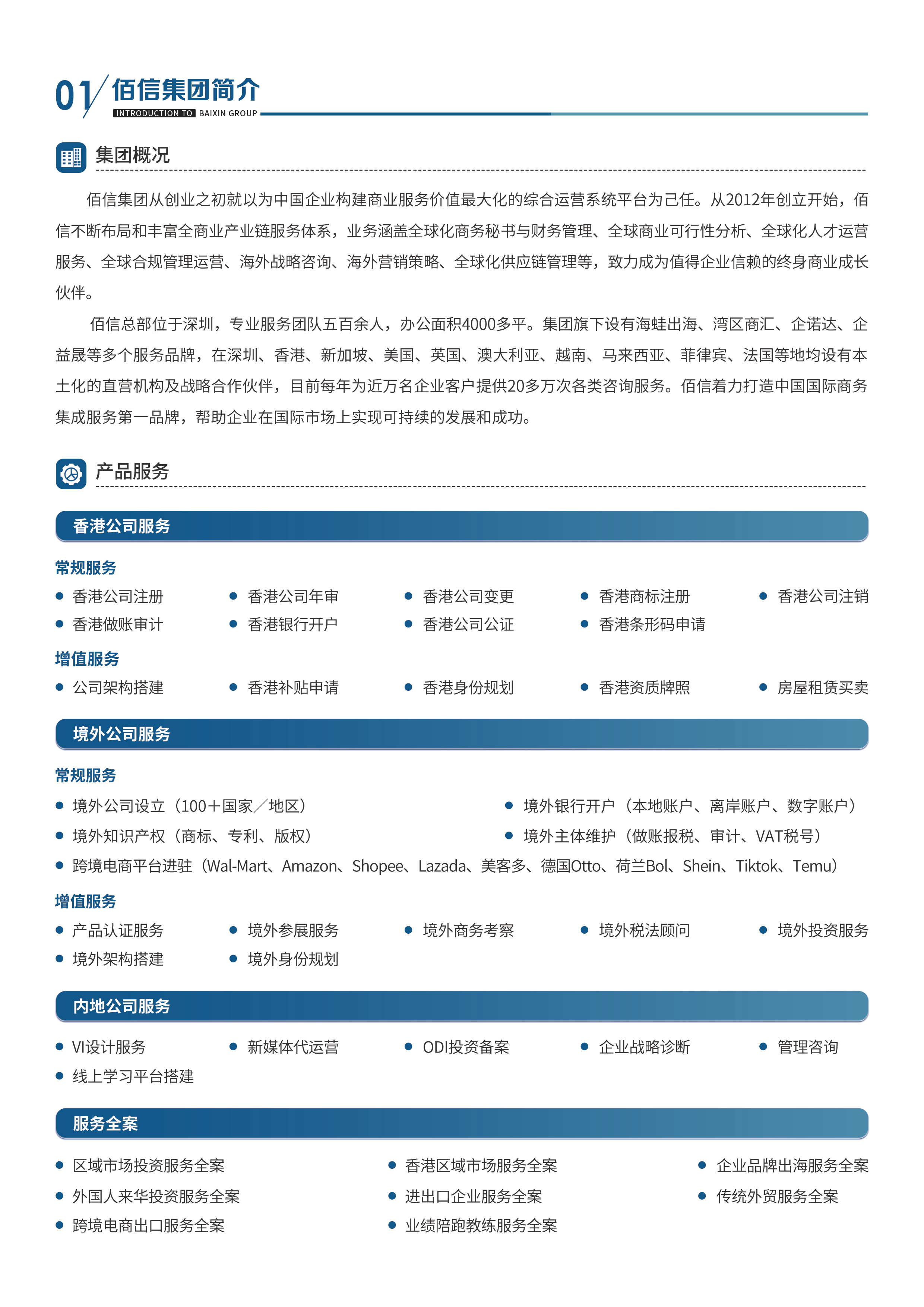 佰信集团始创于2012年,以助推中、外企业全球化发展为己任,致力为中国企业出海提供最具有性价比、持续发展、高附加值的商业服务。佰信集团业务聚焦跨境服务领域,以专业的专家团队、丰富的产品集成、优质的管理服务着力打造全球领先的商业服务品牌。以基础的跨境公司财务及税务、秘书服务为切入点,佰信集团能全方位提供满足企业生命周期各阶段经营、管理需求,涵盖内地、香港、境外100多个国家和地区的跨境综合商务服务。 佰信旗下共有17家公司,总部位于深圳罗湖核心商圈,办公面积4000多平,在香港、珠海、中山、海南、美国、英国、新加坡、澳大利亚等地设有本土化的直营机构,专业服务团队500余人 团队专业:专业团队500+人、组织结构完善,运营高效,跨境出海服务第一梯队、专业一对一赋能 产品创新:全球覆盖109个国家、500余项跨境商务服务项目、业务创新力逐年提升、企业全生命周期咨询服务 经验资深:12年深耕企服行业,香港会计师事务所,香港持牌秘书公司 服务称赞:累计合作2000+家同行,服务50000+家客户,广受认可